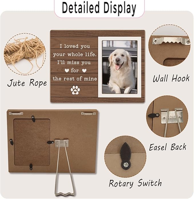 - Dog Memorial Picture Frame: Losing a beloved pet is never easy, but their love stays with us forever.This memorial dog picture frame features heartfelt words, keeping their memory alive and bringing comfort to your heart.