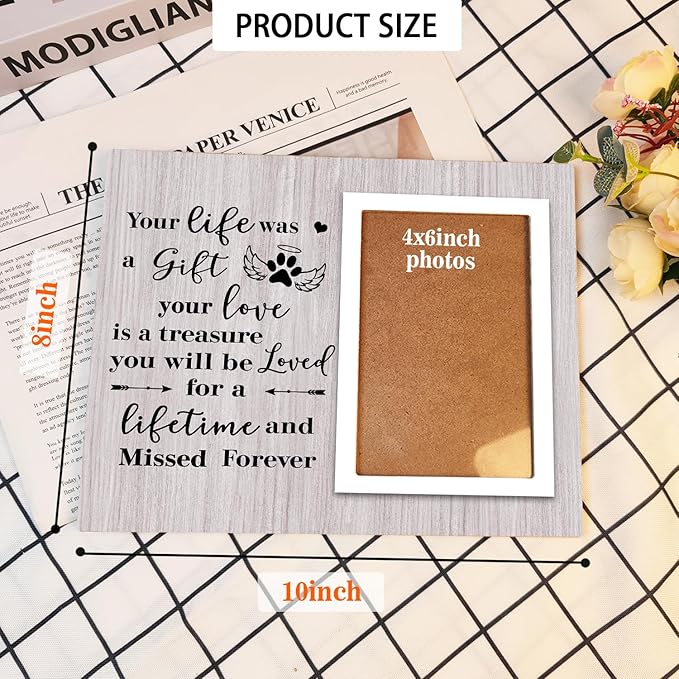 - Cherish the Beautiful Moments:he frame measures 8"L x 10"W and holds a 4 x 6Inches Photo, this pet memorial frame is the perfect way to display your pet’s happiest moments. Whether it’s their joyful smile or their loving presence, this frame keeps their spirit close to your heart.