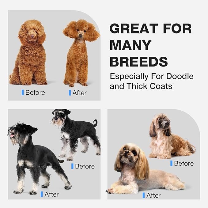 - 【Low Noise and Quiet Motor】The dog clippers for grooming is made of high-speed and quiet motor, noise when working is less than 55 db. It makes your pets no afraid of cutting hair any more. Our motor operating at 6800 RPM, optimized for thick coats, minimizing hair pulling, reducing shaving time by 45%!