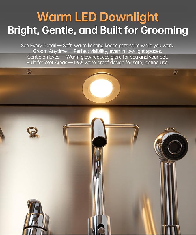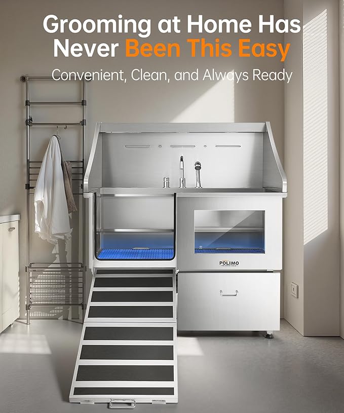 - Innovative and Practical Design: The POLIMO dog grooming station features multiple outstanding design elements: ① IP65 Waterproof high-brightness LED spotlight. ② Grade A tempered glass observation window. ③ The bathtub’s side panels feature a curved slide design, making it easier to operate④ Two-piece floor grid, adjustable to three different heights. ⑤ Sliding storage drawer for organized storage. ⑥ Multi-function faucet and showerhead, adjustable to left, center, or right positions.⑦ Two drainage options are available: one with a pet hair catcher and another stainless steel drain pipe featuring an odor-blocking S-trap design