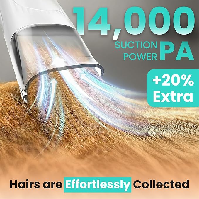 - 【 Powerful 14,000Pa Suction with Quiet Mode 】Our vacuum for dog hair captures fur, dirt, and dander instantly. The low-noise design reduces stress, keeping pets calm during use. Ideal as a dog vacuum for shedding grooming, dog trimmer for grooming, or cat grooming kit.