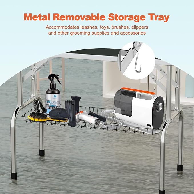 - Thoughtful Details: Premium non-slip and waterproof silicone countertop brings a soft and gentle touch to pet paws and grants a hassle-free pet hair cleaning experience; The rounded table edges and dual leash design avoid pets undesired damage or injury; The reinforced storage shelf accommodates leashes, toys, brushes, clippers, and other grooming supplies and accessories