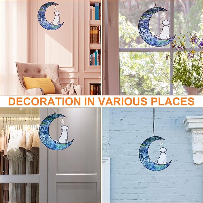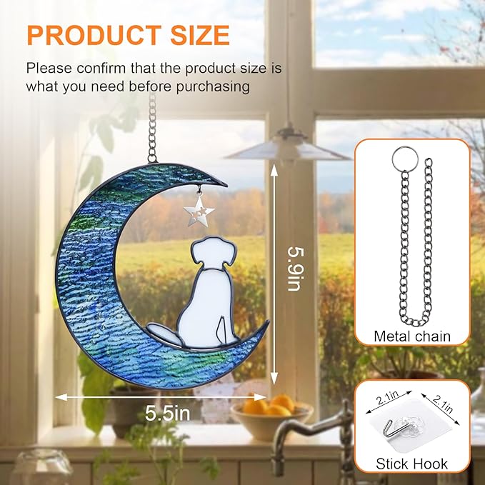 - đžăEasy To Hang Pet Memorial SuncatcherăEach stained glass window hangings dog grief gift will be packed in a box, included iron chain and sticky hooks. Dog bereavement gifts size:5.5''x5.9'', 1.2" sticky hooks.You can indoor window hanging for bedroom, bathroom, kitchen, cafe, office, classroom, porch, balcony, etc.
