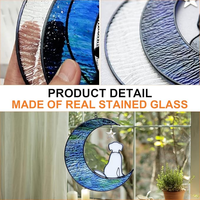 - đžăReal Stained Glass NOT AcrylicăHandmade Stained Glass dog memorial gifts is real glass not acrylic as many suncatchers are.The colors are nice and bright and the details are pretty,which is color-fast. It is a good choice for home decoration,whether hanging on the window or the wall.All items are designed by ourselves that got copyright protection already.