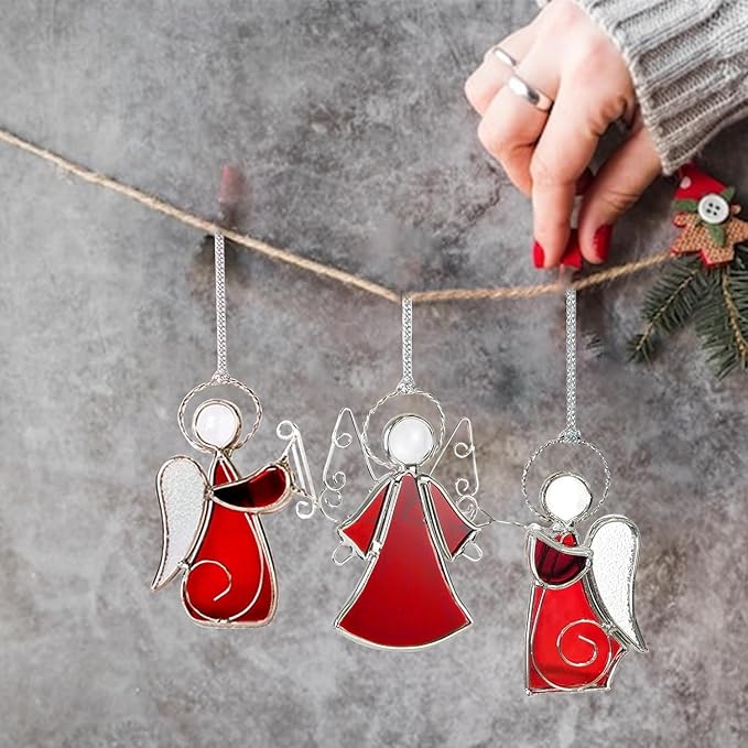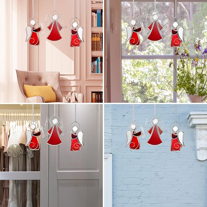 - đăEasy to Hangă- Each stained glass Angel suncatcher ornament comes with a metal ring, you can use a string to hang it anywhere you want to decorate. It's a hassle-free way to add a beautiful touch to any space.Wherever the place is - Christmas Tree, glass doors, kitchen window, upstairs windows, circle-head window, front window, bedroom window, kitchen door or as welcome signs on hanger stands.