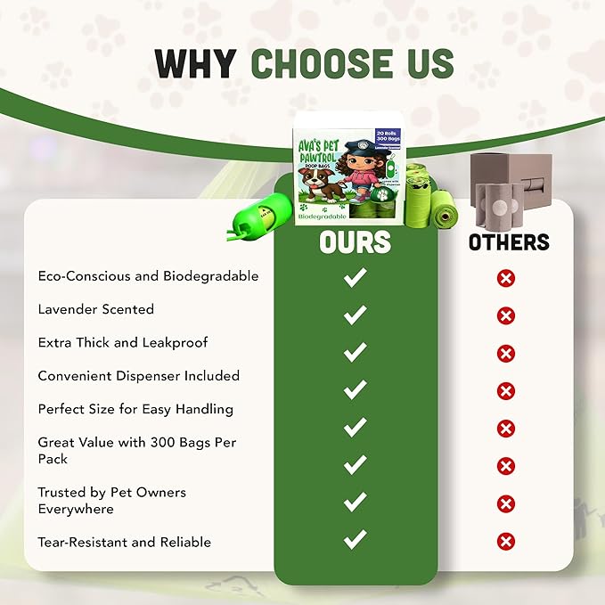Ava’s Pet Pawtrol Dog Poop Bags Rolls w/Dispenser - 300 Biodegradable, Extra Thick, Leakproof, Heavy Duty Poop Bags for Dogs, Lavender Scented, Odor Control, Easy-Tear, Eco-Friendly, Puppy Essentials