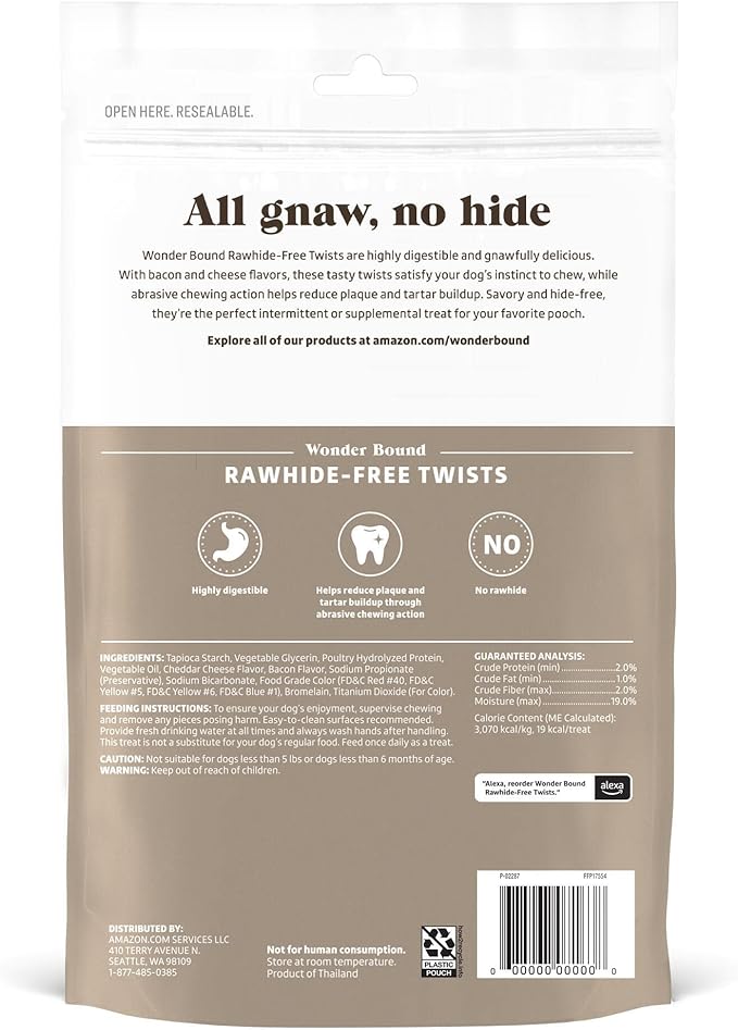 Amazon Brand - Wonder Bound Bacon & Cheese Flavor Dog Twist Sticks - 55 Count - Rawhide-Free Dog Treats, Dental Health Chews for Plaque & Tartar Control, Easy to Digest, Long-Lasting (Pack of 2)