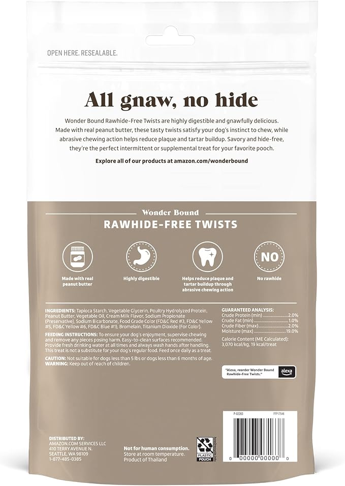 Amazon Brand - Wonder Bound Peanut Butter Flavor Rawhide Free Twists Dog Treats, Long-Lasting, Easily Digestible Dental Health Chews, 55 Count, 12 Ounces (Pack of 2)