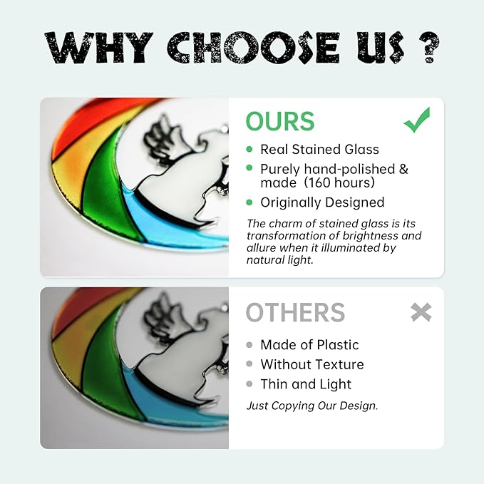 - 【Warm Tips】:Each stained glass pendant comes in a gift box, including metal chain and sticky hook. Please feel free to contact us for any breakage and quality problem of the stained glass, we will reply within 24 hours to solve the problem.