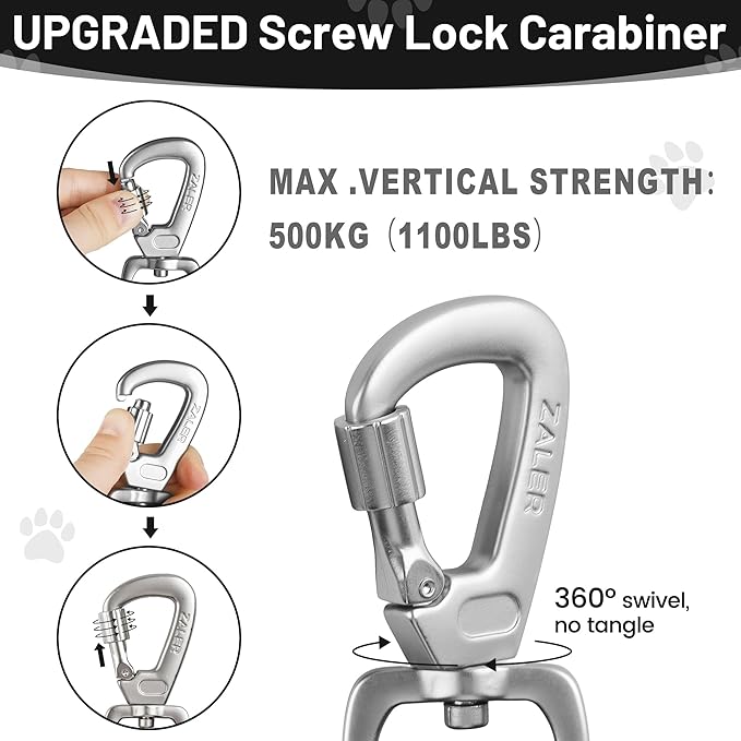 - 【UPGRADED Safety Screw Lock Carabiner】We have upgraded our carabiner to a screw lock type for all dog leashes. Manual screw gate reduces the chance of open-gate failure. There is a smooth screw action on the locking mechanism. Perfect screw gate locking feature for our short dog leashes!!! It can greatly increase the safety of your beloved furry friends.