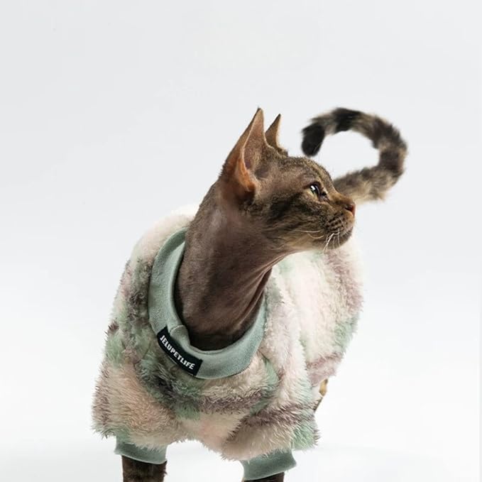 Cat Double-Sided Fleece Clothes, Soft Warm Winter Jumpsuit Sweater Shirt Clothing for Hairless Sphynx, Devon & All Indoor Kittens (Green,L)