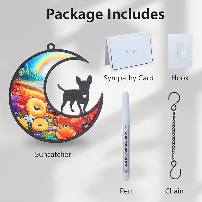 - What’s Included: --1 Suncatcher,1 chain,1 hook,1 pen,1 card (with rainbow bridge poem for loss of dog) 《Sealing Label Pattern Random》