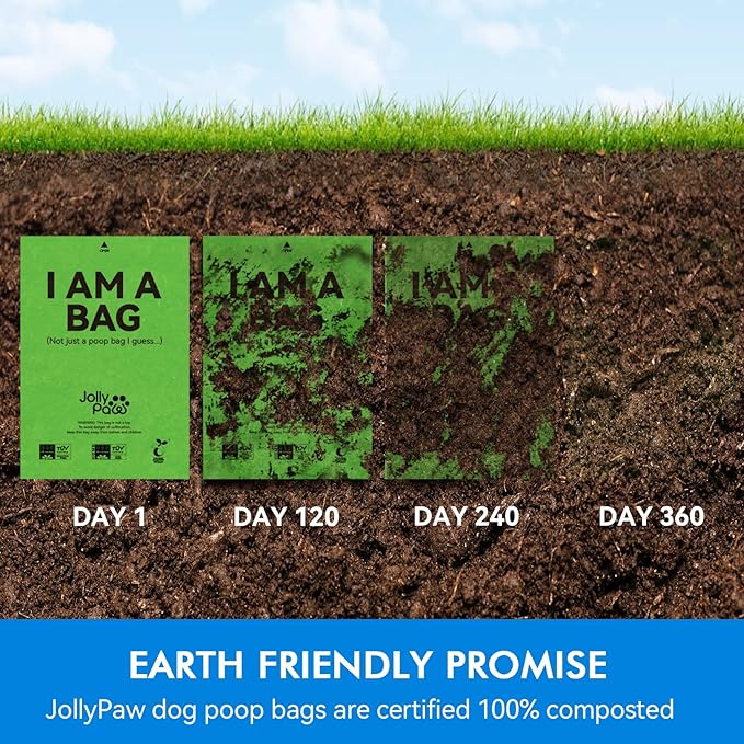 - 【Environmental Friendly】: Biodegradable poop bags are EN13432 certified and can be decomposed and composted in both domestic and commercial environments. JollyPaw compostable dog poop bags are made of innovative environmentally friendly materials