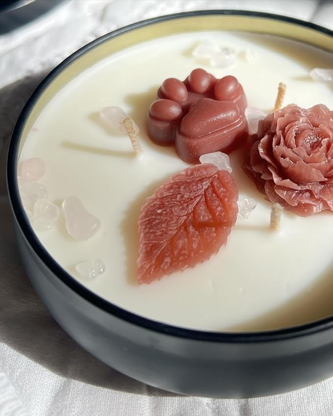 - ROSE QUARTZ FOR HEALING LOVE – Decorated with natural rose quartz stones, symbolizing comfort, serenity, and unconditional love, this candle is a meaningful dog bereavement gift for grieving pet parents.
