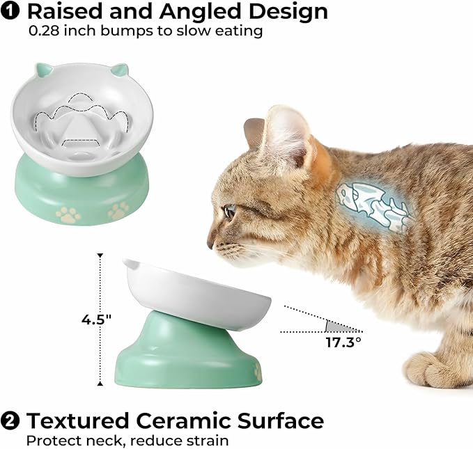 Y YHY Slow Feeder Cat Bowl, Ceramic Elevated Cat Bowl Tilted Design Slow Feeder for Dog and Cat for Dry and Wet Food, Green
