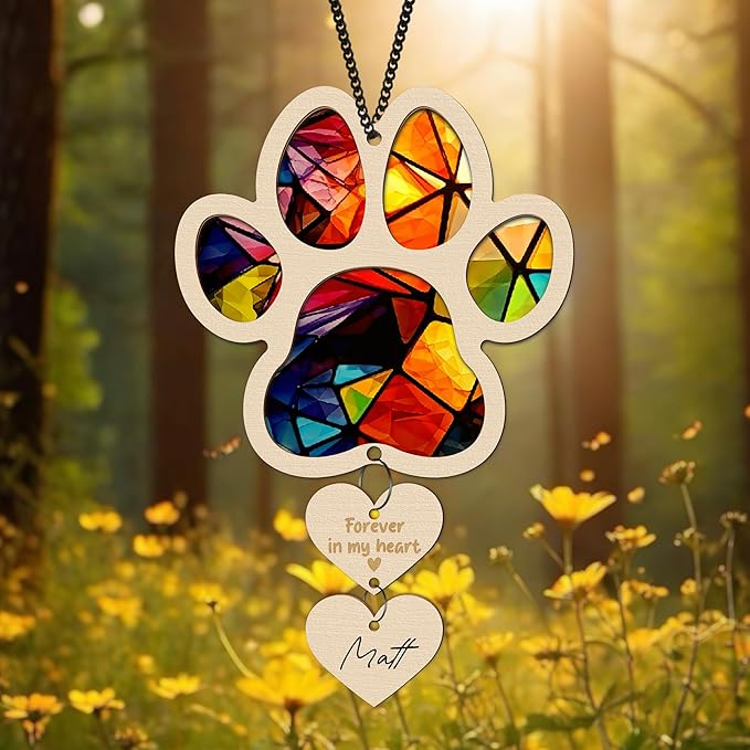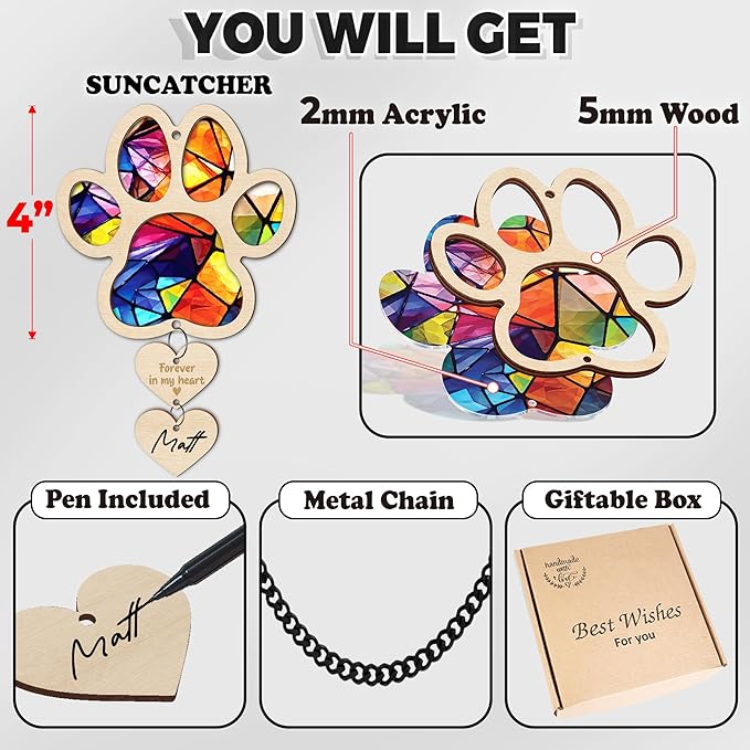 - Package Includes: 1 Pet Paw Suncatcher Memorial, 1 Pen, and 1 Gift box. This charming pet paw design serves as a heartfelt reminder of your beloved four-legged friend, evoking cherished memories.