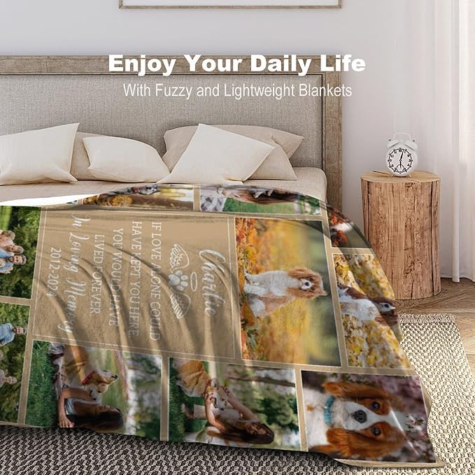- đăPersonalized Pet BlanketăChoose the design you liked, click "CUSTOMIZE NOW" button and Upload photo of your Pet, Enter Pet Name or text in Pet memorial blankets. Personalized memorial throw blanket to record all the beautiful moments. Custom photo blanket is the perfect way to celebrate your pet's life and forever cherish their memory.