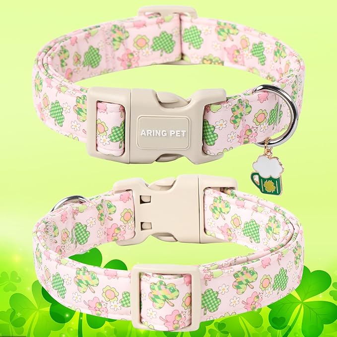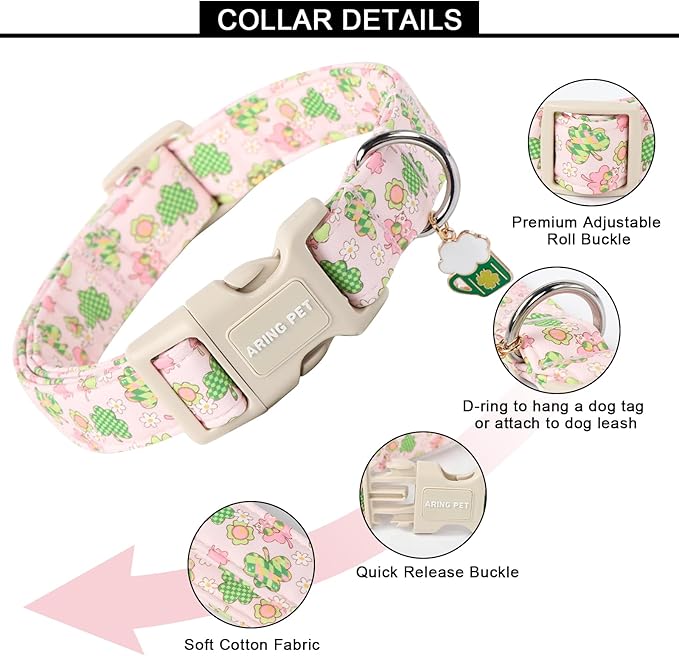 ARING PET St Patrick's Day Dog Collar-Cute Pink Clovers Dog Collars, Adjustable Shamrock Pet Collars Trefoil Puppy Collar with Quick Release Buckle for Girl&Boy Dogs
