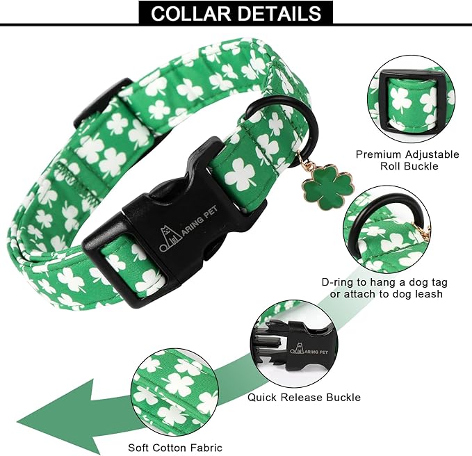 ARING PET St Patrick's Day Dog Collar-Cute Green Clovers Dog Collars, Adjustable Shamrock Pet Collars Trefoil Puppy Collar with Quick Release Buckle for Girl&Boy Dogs