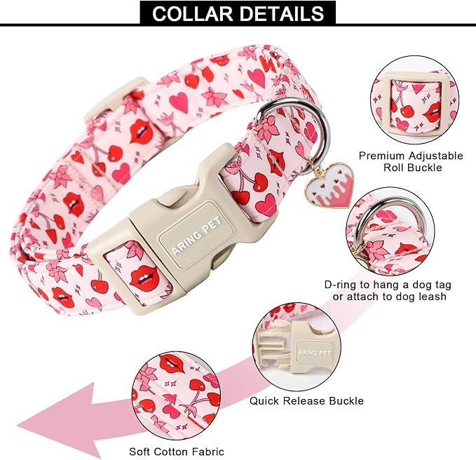 ARING PET Valentine's Day Dog Collar, Cute Pink Cherry Lips Pet Collars with Quick Release Buckle for Puppy Small Medium Large Girl Boy Dogs Cotton-XS
