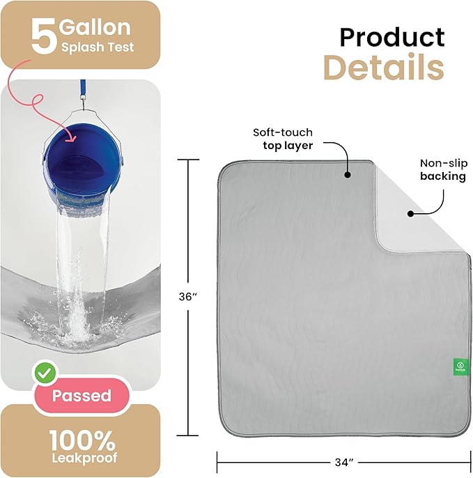 IMPROVIA® Washable Underpads, Heavy Absorbency Reusable Incontinence Pads for Kids, Adults, Elderly, and Pets, Waterproof Protection Floor (Gray, 34"x36" (Pack of 4))