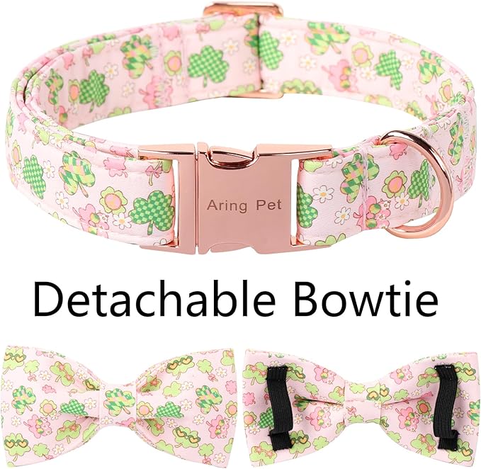 ARING PET St Patrick's Dog Collar with Bow, Cute Pink Shamrock Clovers Pets Detachable Bow Tie Collars for Puppy Small Medium Large Girl Boy Dogs-M