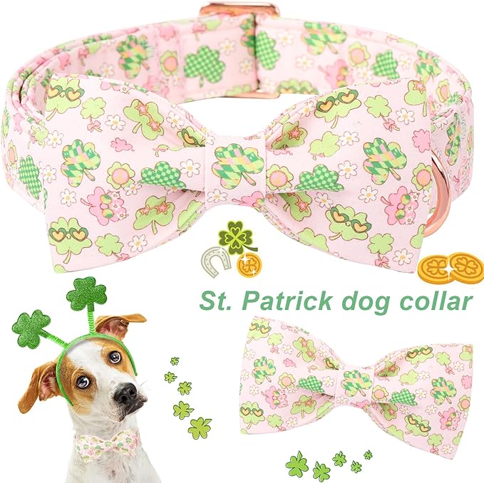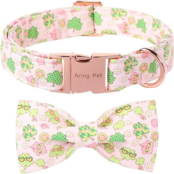 ARING PET St Patrick's Dog Collar with Bow, Cute Pink Shamrock Clovers Pets Detachable Bow Tie Collars for Puppy Small Medium Large Girl Boy Dogs-L