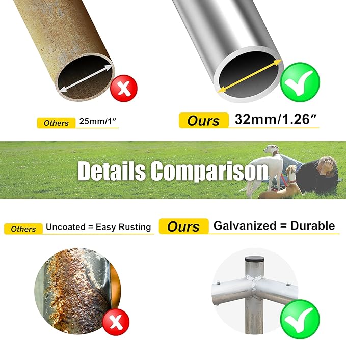 - 【⭐Upgraded Structure and Stronger Material】: The HEASON upgraded outdoor dog kennel is made of 1.25-inch thick galvanized metal pipes and 2.5mm steel wire mesh, which is not only more durable and rust-resistant, but also has raised legs that can be inserted into the ground to ensure that the kennel is not easily moved.