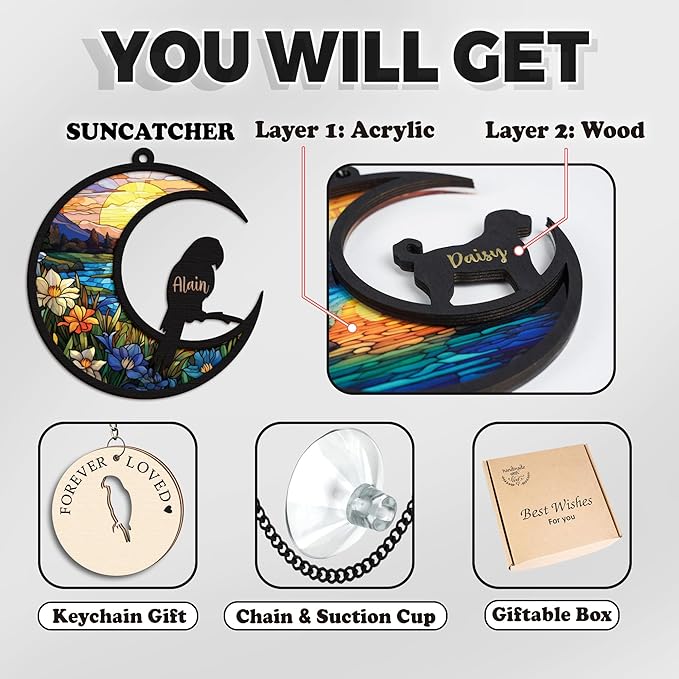- Premium material: Meticulously crafted from eco-friendly plywood and high-quality acrylic, our 8mm thick Pet Sympathy Suncatchers use advanced UV-printing technology to ensure vibrant, sharp details and a durable, long-lasting finish.