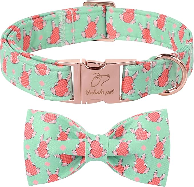 Easter Dog Collar With Bow Tie - Bunny Egg Pattern Bowtie Adjustable Heavy Duty Spring Collar for Small Medium Large Dogs XS