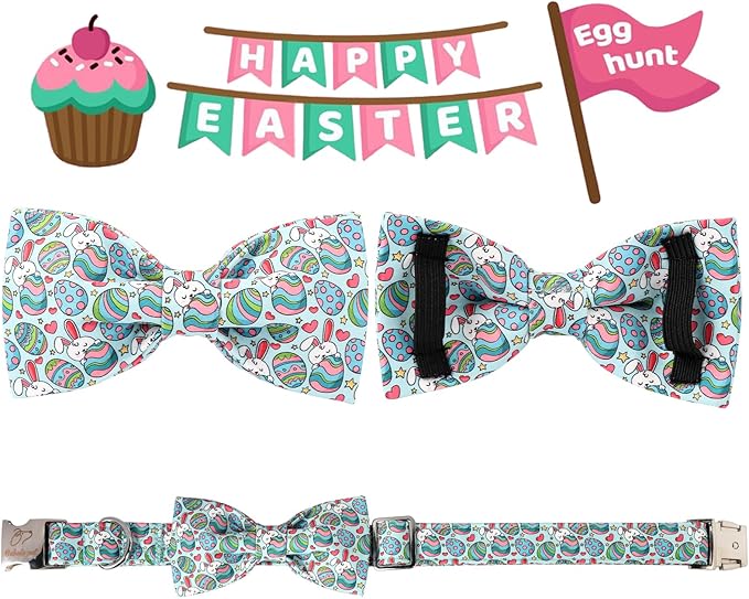 Easter Dog Collar with Bow Tie, Easter Eggs Bowtie Dog Collar with Safety Metal Buckle, Cute Boy Girl Dog Easter Bunny Collar for Medium Large Dogs, L