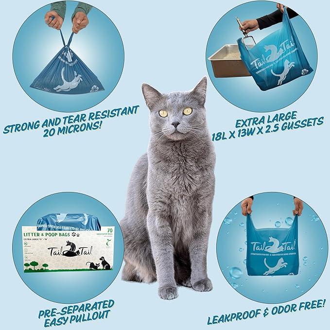 Biodegradable Cat Litter Bags for Poop and Pee (70 Extra Large 18 X 18 with Gussets expanded). Leak proof, Durable, Unscented, Compostable, Strong, with Handles.