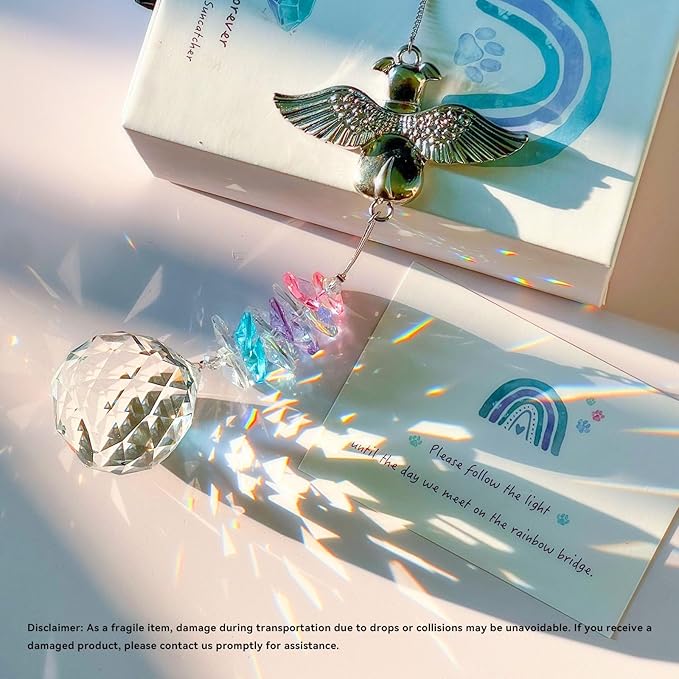 - Eternal Glowing Remembrance: Our pet memorial sun catcher is made from a 40mm top-grade clear crystal ball, adorned with colorful ultra-thin diamond-shaped crystals at the top. With exceptional transparency and refractive index, it creates brilliant rainbow light. When illuminated by the sun, the winged pet dog is surrounded by a spectrum of colorful rays, evoking the image of a beloved pet standing on a rainbow bridge, hoping to reunite with us one day.