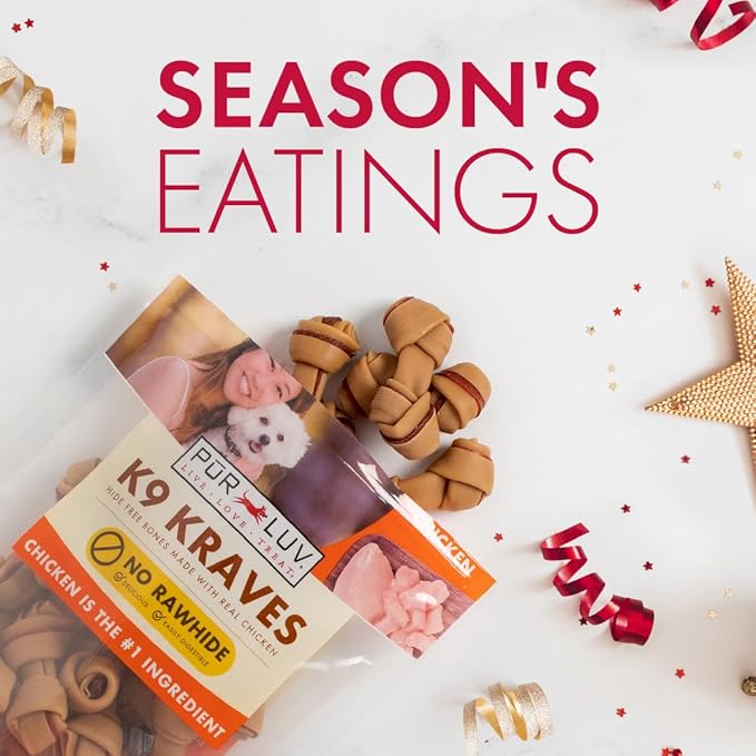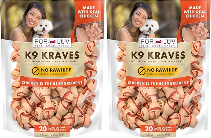 Pur Luv K9 Kraves Rawhide Free Bone Dog Treats, Chicken Flavor, Made with Real Chicken and Limited Ingredients, Healthy, Easily Digestible, Long Lasting, and High Protein Dog Treat, 20 Count