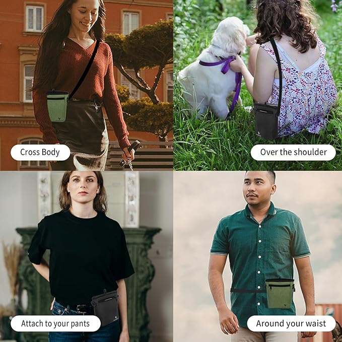 - 【Multifunctional】There are three different ways to wear a dog therapy training bag. You can hang it directly on your belt or leash forr use as a dog treat bag, or hang it around your waist for use as a dog treat fanny pack, or as a training pouch on your shoulder.