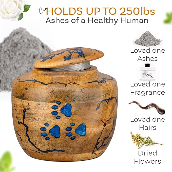 - Elegant Design with Blue Resin Paws & Lichtenburg Art: The INTAJ Wooden Pet Urn features a stunning combination of blue resin paw prints and intricate Lichtenburg designs, making it a beautiful and unique memorial for your beloved pet. The artistic craftsmanship ensures that each urn is one-of-a-kind, providing a special place to honor your pet's memory.