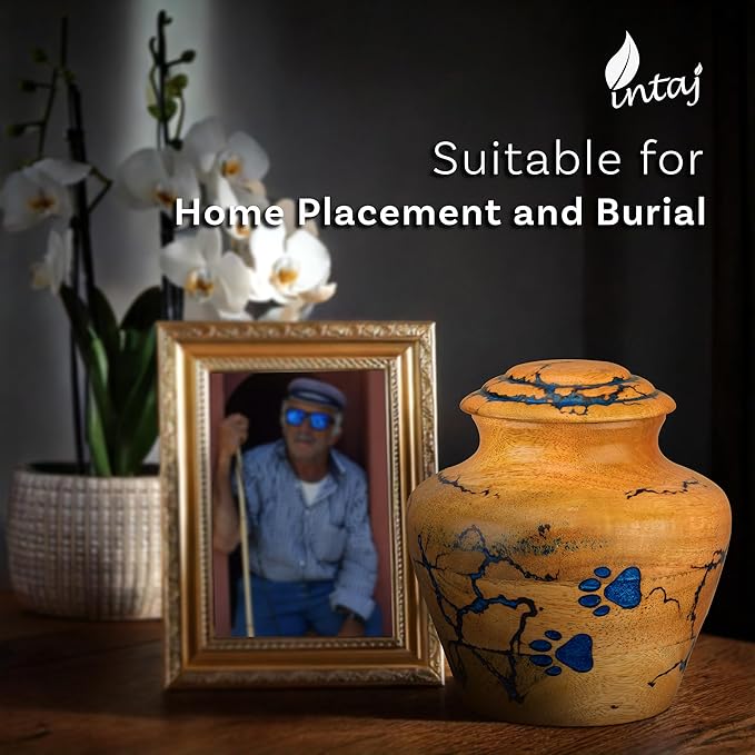 - Elegant Design with Blue Resin Paws & Lichtenburg Art: The INTAJ Wooden Pet Urn features a stunning combination of blue resin paw prints and intricate Lichtenburg designs, making it a beautiful and unique memorial for your beloved pet. The artistic craftsmanship ensures that each urn is one-of-a-kind, providing a special place to honor your pet's memory.