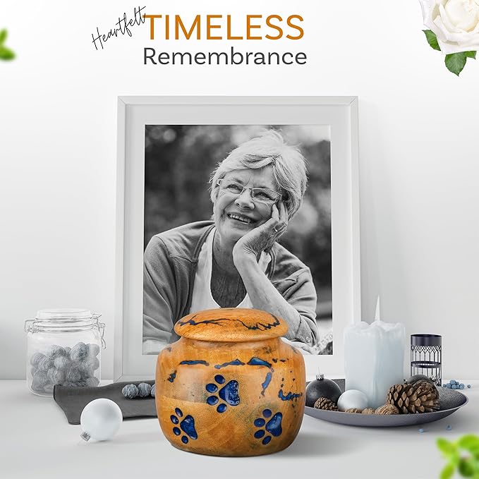 - Elegant Design with Blue Resin Paws & Lichtenburg Art: The INTAJ Wooden Pet Urn features a stunning combination of blue resin paw prints and intricate Lichtenburg designs, making it a beautiful and unique memorial for your beloved pet. The artistic craftsmanship ensures that each urn is one-of-a-kind, providing a special place to honor your pet's memory.