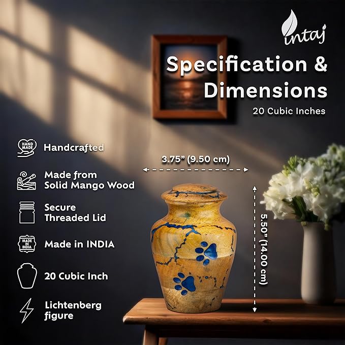 - Elegant Design with Blue Resin Paws & Lichtenburg Art: The INTAJ Wooden Pet Urn features a stunning combination of blue resin paw prints and intricate Lichtenburg designs, making it a beautiful and unique memorial for your beloved pet. The artistic craftsmanship ensures that each urn is one-of-a-kind, providing a special place to honor your pet's memory.
