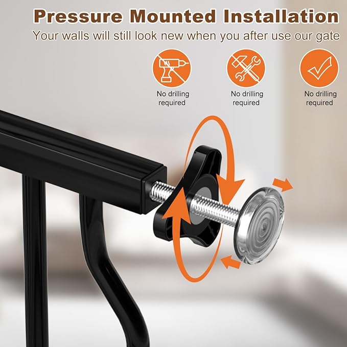 - Easy Installation: Our baby gates extra wide featuring a pressure-mounted design, this pet gates for doorways no drilling, it comes with 4 adjustable pressure bolts, no additional tools required, and no need for wall holes, just install it on the four corners of the tall door gate bar, This mounting design prevent damage to walls. Please don't cut the tie until you successfully install the wide baby gates for dogs, contact us if you encounter any installation issues