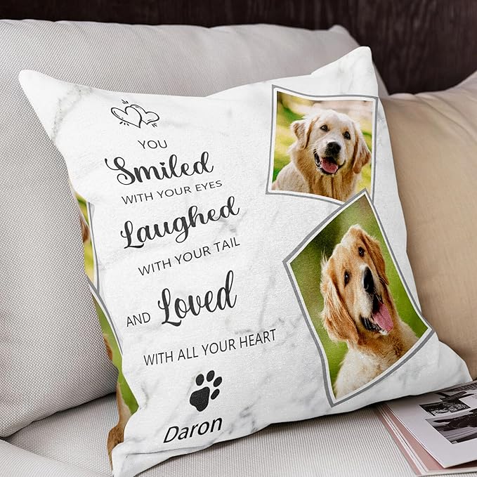 • Dog Memorial Gifts for Loss of Dog: Preserve your favorite photo of your pet in a perfect design, including oil painting or watercolor styles. This personalized throw pillow is a meaningful way to keep your pet’s memory alive.