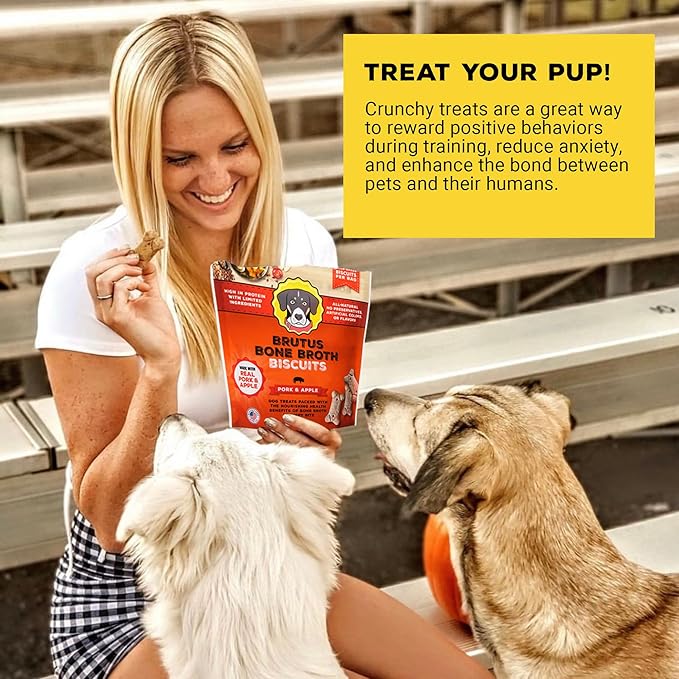- The same Brutus Broth taste your dog has grown to love—only now in the form of a dog treat! New formulation! Our pork and apple flavored dog biscuits are sure to be the bark of the town. High in flavor and packed with protein from real pork meat, dog bone broth and superfood apple, our natural dog treats were created with your dog’s health and happiness in mind