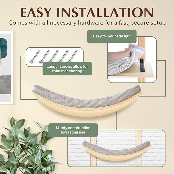 - HIDDEN MOUNTS & MINIMALIST STYLE – The floating cat shelf maximizes space while blending seamlessly into any home. Its hidden mounts and screws create a modern, minimalist look, making it a stylish addition to any cat climbing wall or wall-mounted cat furniture setup.