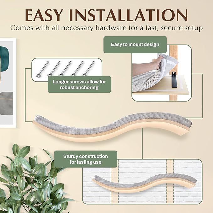 - EXTRA LARGE WAVE S SHAPE SHELF- Our Wave, S-shaped climbing shelf measures 35.4” (L) x 11.6” (W) x 2” (T), providing ample space for your cat(s) without taking up valuable floor space. This space-saving wall-mounted cat shelf has a unique design that offers a modern, stylish look and seamlessly blends with your home décor. Perfect for those looking for floating cat shelves or cat wall furniture to save space. It is perfect for all size cats, and multiple cats as well!