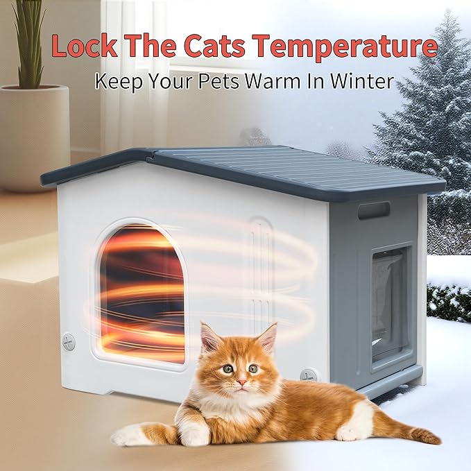 Plastic 100% Insulated Outdoor Indoor Cat House for Winter, Outdoor Cat Houses with Insulated Liner, Waterproof Outside Cat Shelter, Assemble Easily-Grey