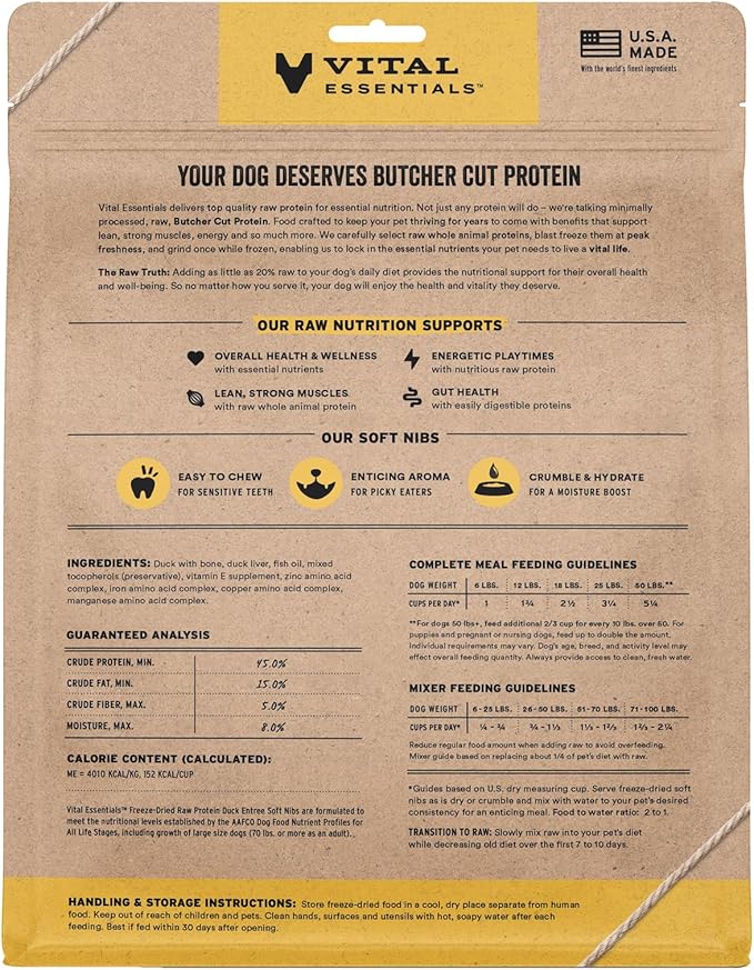 - SOFT NIBS FREEZE-DRIED RAW DUCK DOG FOOD: Vital Essentials Freeze Dried Soft Nibs Dog Food packs more protein than industry standard into every soft bite to deliver the peak vitality your dog deserves, especially when compared to dehydrated dog food. This complete and balanced freeze-dried raw dog food is made with premium Butcher Cut duck, responsibly sourced in the EU.