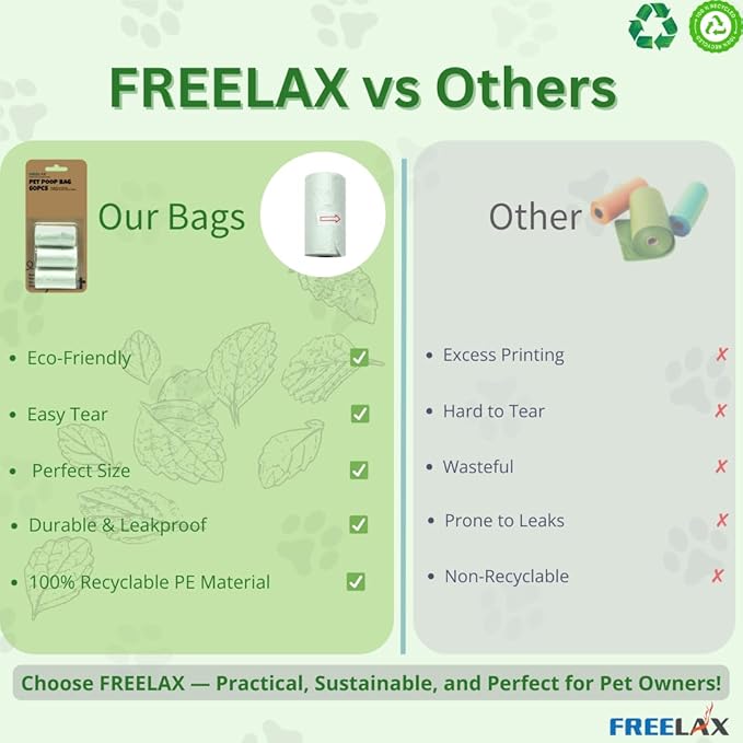 - 🌍 Biodegradable & Compostable Trash Bags: FREELAX poop bags are made with 100% recyclable PE material, offering an eco-friendly alternative to traditional plastic bags.