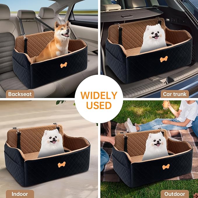 Car Seat for Large Size Dog, Booster Seat for Dogs Under 55 lbs or 2 Small Dogs, Soft Car Dog Bed Filling in Thick Memory Foam with 2 Safety Leashes and Storage Pocket (Brown/Black)
