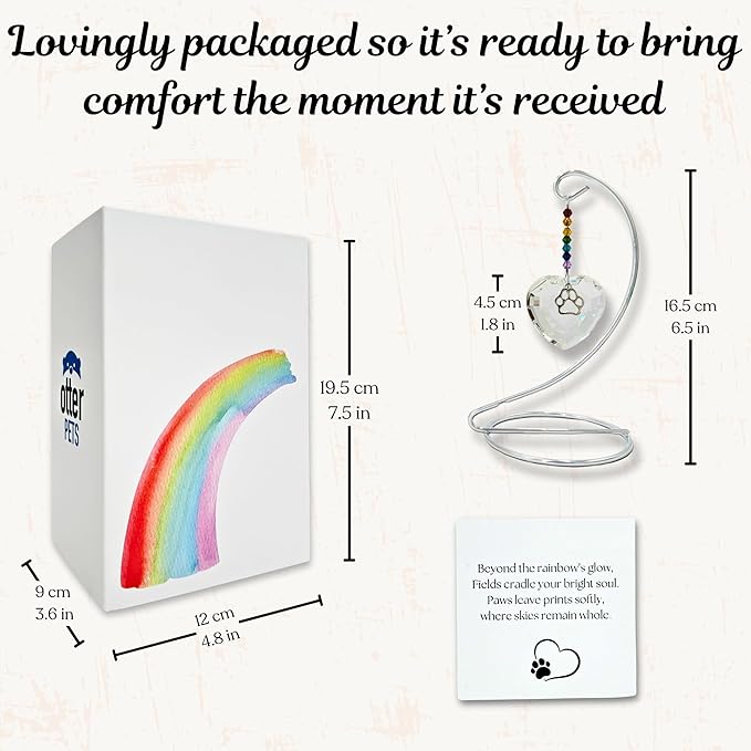 - Ready-to-Gift Premium Packaging – Comes in a beautiful gift box with an uplifting message: “Beyond the rainbow’s glow, fields cradle your bright soul…”—making it perfect to send directly as a dog loss sympathy gift.