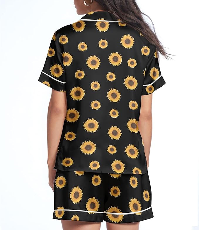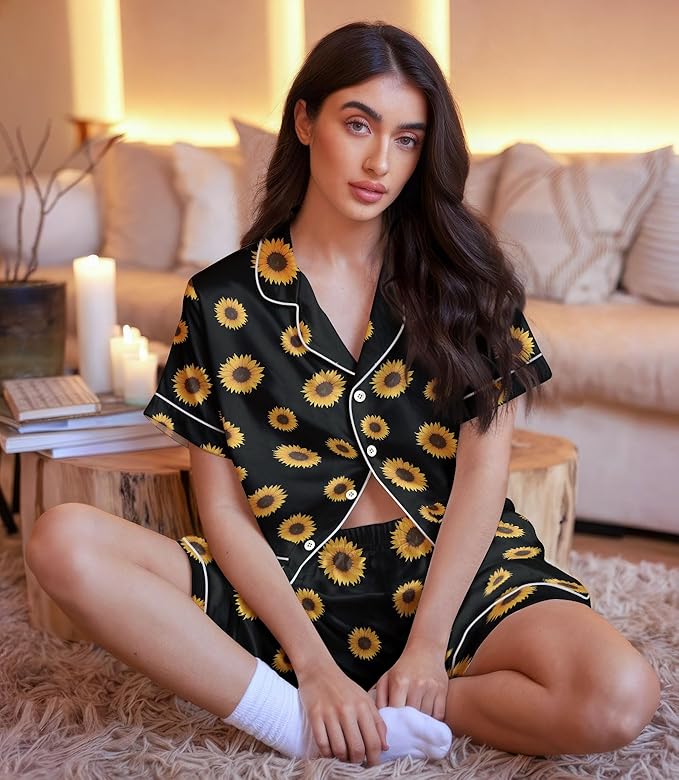 Women’s Silk Satin Pajama Set, Short Sleeve Button Down 2 Piece PJs with Shorts, Cozy Loungewear & Matching Holiday Pajamas